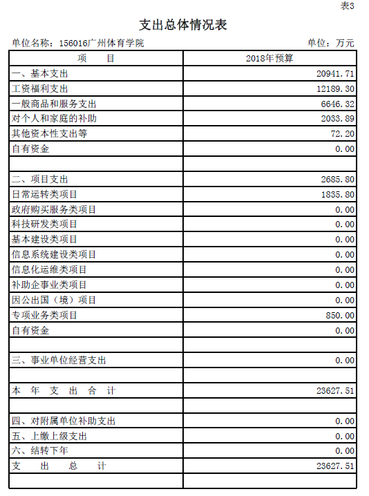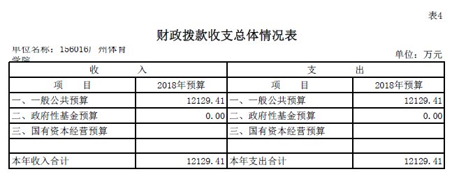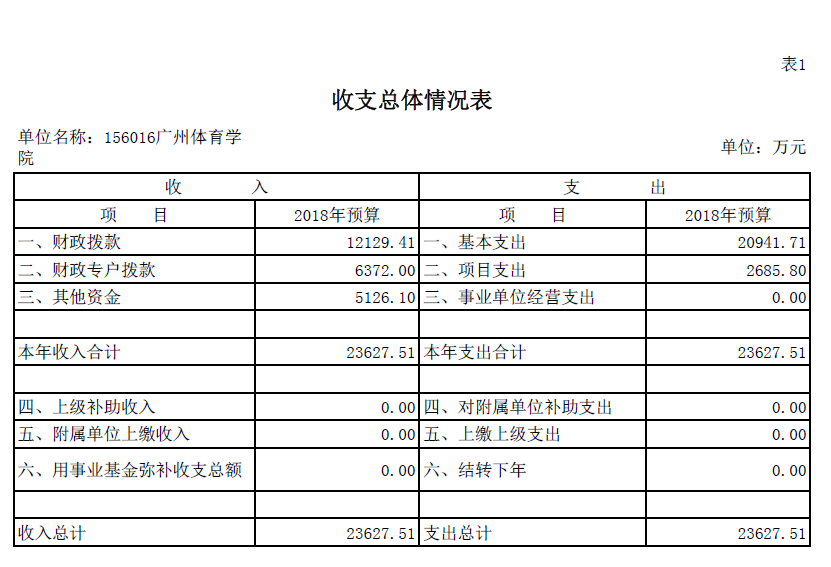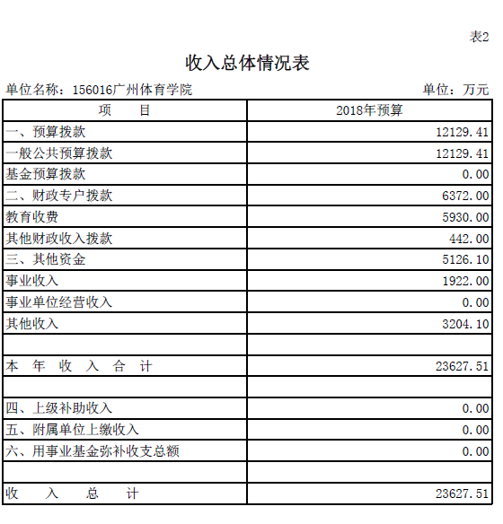 本年预算总收入为 23,627.51万元,较上年度预算 20,855.77万元增加收入2771.74万元。预算收入由预算拨款、财政专户拨款、事业收入和学院其他资金收入组成。其中预算拨款12,129.41万元,较上年预算11,684.67万元增加444.74万元,主要原因是:生均综合定额拨款、离退休经费增加,但奖助学金专项拨款减少。另外培训费等事业收入1522万元,较上年预算增加1246.4万元,主要是因增加足球的国培、省培和市培等使事业收入增加;其他收入2835.1万元,较上年预算收入增加678.8万元,主要是我校在2017年起诉天河仓长期欠交物业租金,在编报部门预算时尚未有最终结果故该租金收入未纳入预算,现我校与原承租方以及实际使用第三方已签订协议,由实际使用第三方按使用期限每月缴租,故从2018年起租金增加1233.6万元,另学院运动商城一二楼改造为体育医院使后勤租金收入减少200万元。